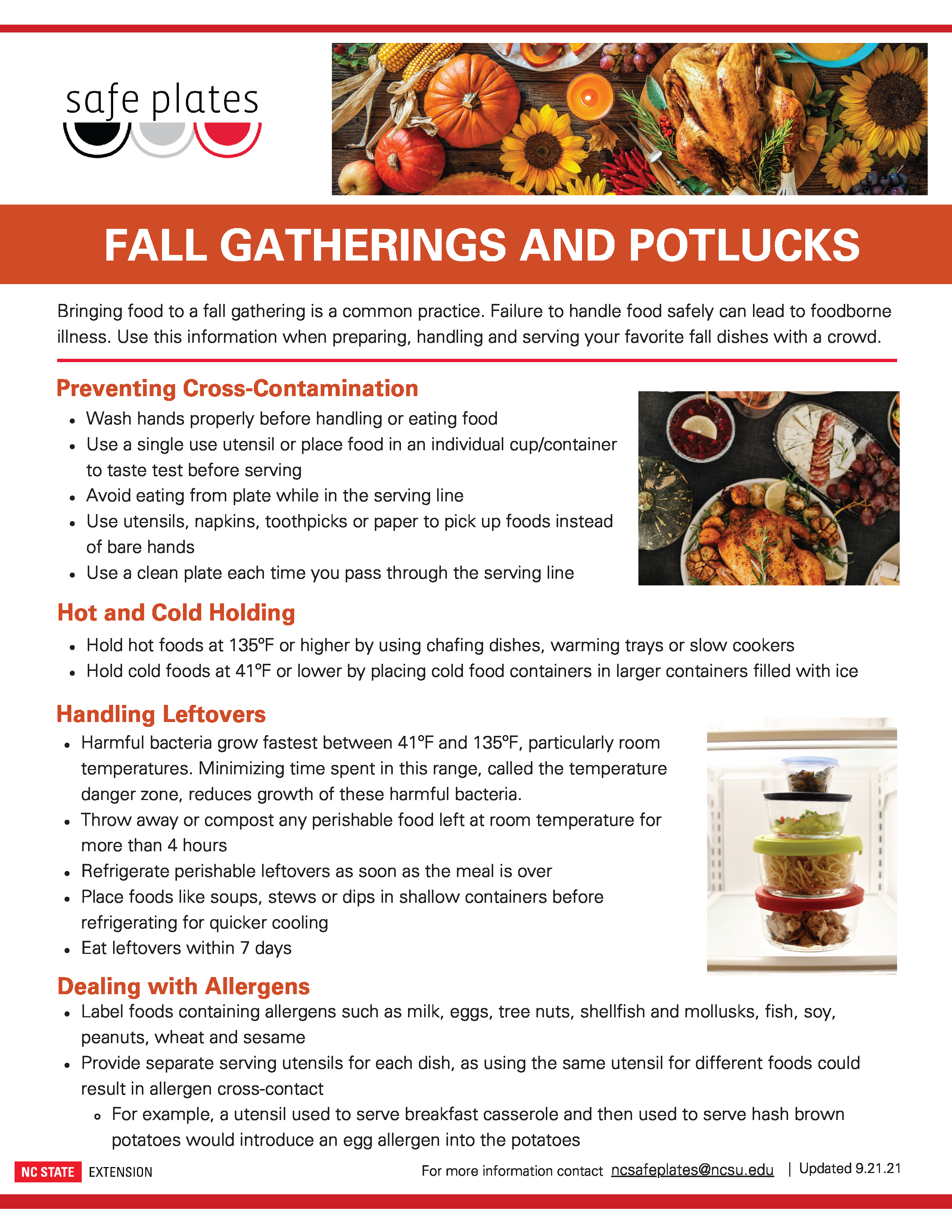 Bringing food to a fall gathering is a common practice. Failure to handle food safely can lead to foodborne illness. Use this information when preparing, handling and serving your favorite fall dishes with a crowd.